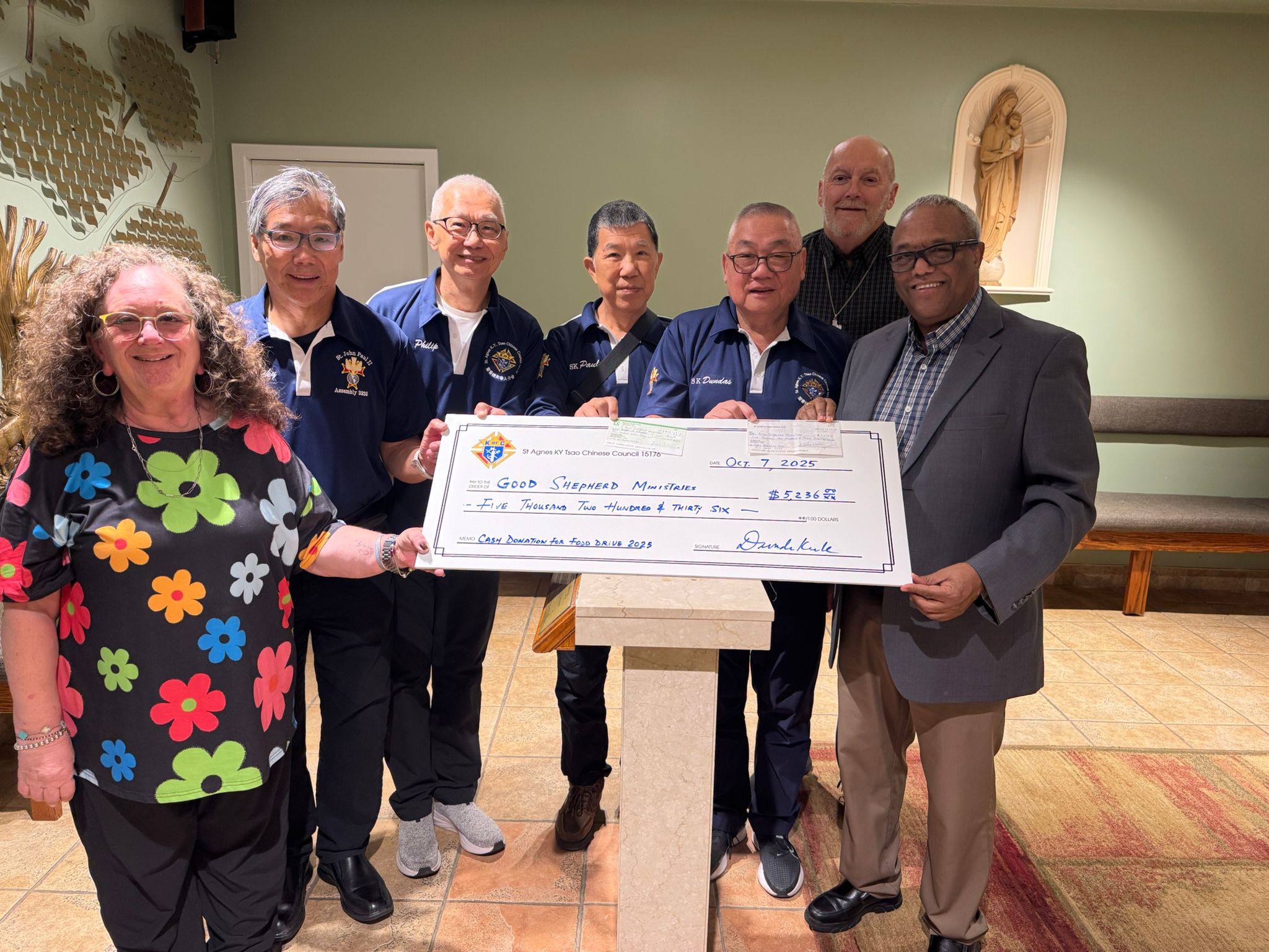 Submitted by Teddy FungSt. Agnes KY Tsao Chinese Council 15176Knights from St. Agnes KY Tsao Chinese Council 15176, Markham, Ontario presented a donation of $ 5,636 to Good Shepherd Ministries in Toronto, received by Executive Director Aklilu Wendaferew (right) and his team Cindy (left) and Deacon Paul (back). The cheque was accompanied by 2,374 lbs. of food delivered on September 30, 2025.